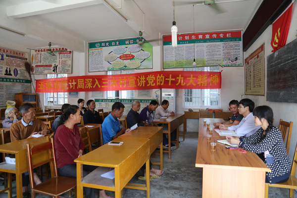 11月10日,玉林市统计局组建的党的十九大精神宣讲队,由党支部书记、副局长钟永新带队一行五人,深入市统计局帮扶联系的陆川县清湖镇三水村宣讲。